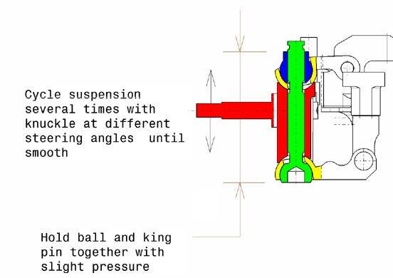 Apply polish to both balls on the king pin and on the upper ball. While holding the assembly together, cycle the suspension up and down. Position knuckle in different positions while cycling it. Cycle until it feels smooth. Wash polish off.