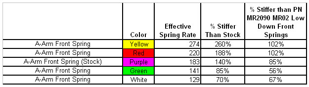 The following is a spring chart that compares A-arm suspension springs with similar MR02 low down spring. The color order for A-arm spring is different than regular spring. The purple spring is the stock one that is included in the A-arm suspension kit. The only difference is the kit one is not painted. Notice that the spring for the A-arm suspension is overall stiffer than the standard spring used on MR02. The car tends to handle better with stiffer springs. In case you are wondering, you can easily swap in a MR02 spring to test out what happens with a softer spring. You will need to use a plastic wheel nut as a spacer to make up for the difference in spring length.