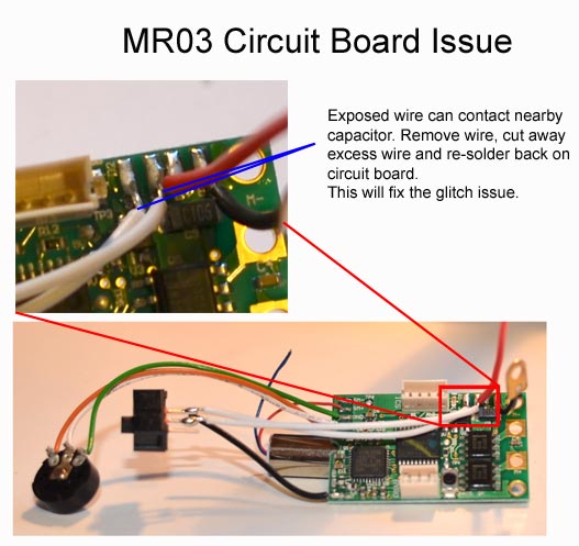 Some have reported that there is a glitch on some MR03. After extensive investigation in the mini-zracer forum, it was discover that the wire for the on/off switch can touch the contacts of the near by capacitor. The solution was to un-solder the wire from the circuit board, shorten the exposed lead and re-solder back on the board. Circuit board is small, so some careful soldering is required. While you are at it, fix both wires for the switch to prevent any issues.