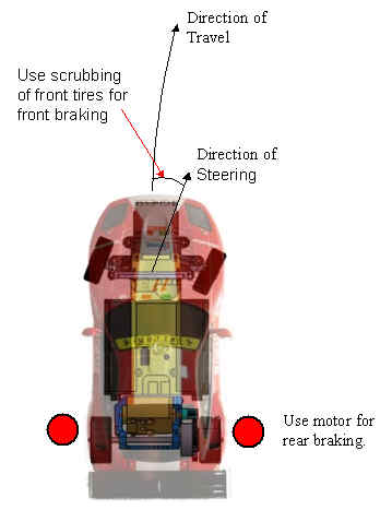 Another way to get the front wheel to do some braking. When you steer, it the same as braking. Is obvious if you want the car to go as fast as possible, the front wheel should be pointed straight. Everyone knows the car slows down whey you steer. Therefore, if you do want to slow down, steer the front wheels. This is especially true if car is set up to understeer. If you snap the front wheels to turn suddenly, the entire car can't react that fast, so the front wheel is turned while the car is still moving forward. This scrubs off speed. Use the motor to brake the rear. Now you have 4 wheel braking. That should slow the car down enough for the corner.