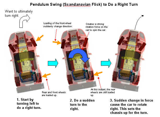 When you turn the front wheel left, cornering forces push the front and rear wheel left. What happen when you suddenly turn the front wheel the opposite direction to the right. Instantly, cornering force go away from the front wheel. Is no longer generating left force. Instead, is generating right cornering force. But what happen to the rear wheel. It is still generating left force. So what you have is front wheel is generating right force, and rear is generating left force. That is a huge amount of force to spin the car in a violent manner to set ti up for the corner. In a real car, you can spin out even a understeering front wheel car with this manuver.